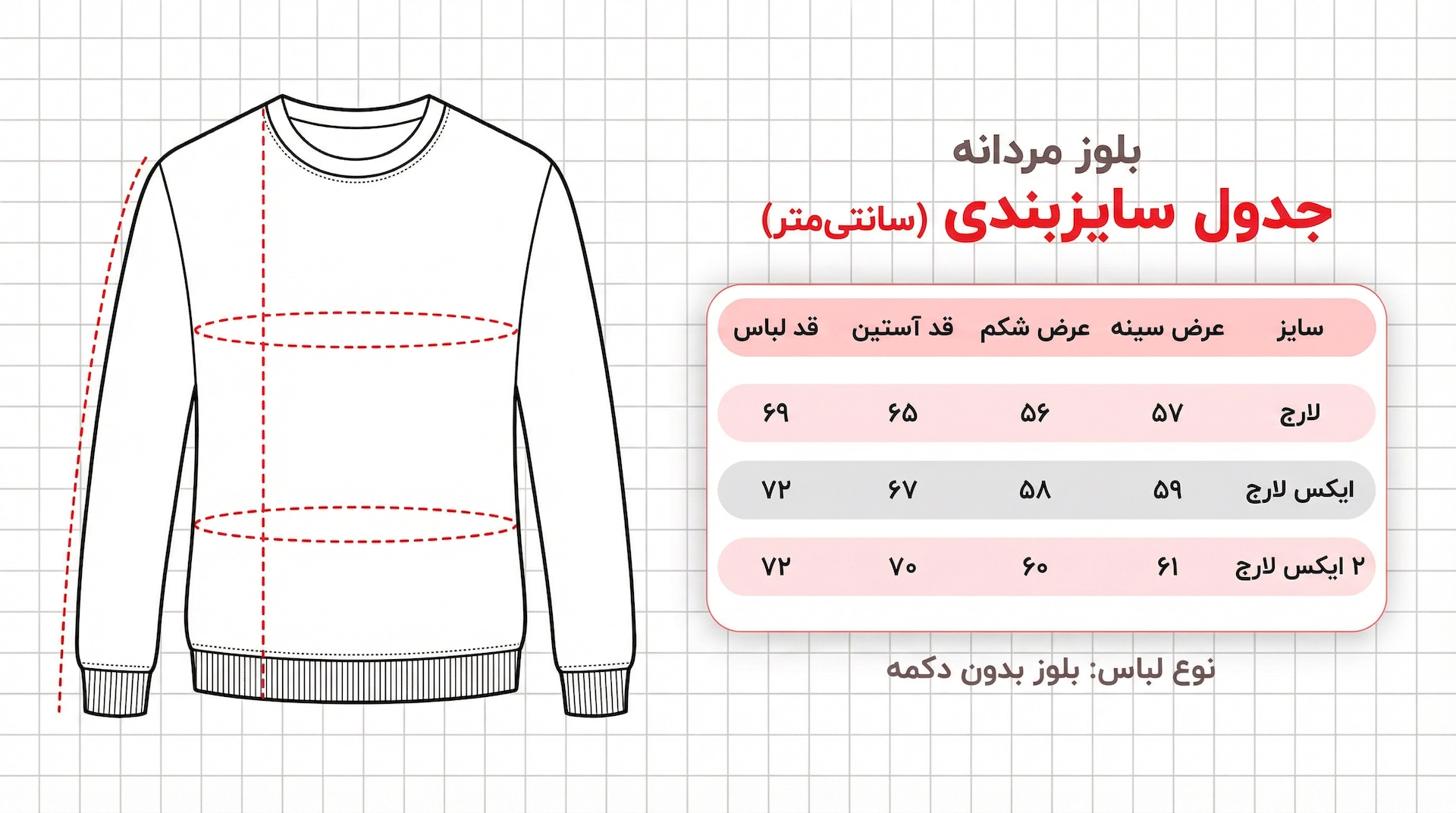 سایز : L دورسینه : 57 عرض شکم : 56 قد آستین : 65 قد لباس : 69 سایز : XL دورسینه : 59 عرض شکم : 58 قد آستین : 67 قد لباس : 72 سایز : XXL دور سینه : 61 عرض شکم : 60 قد آستین : 70 قد لباس : 72