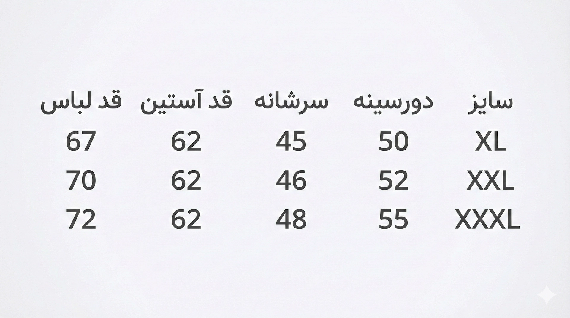 سایز : XL دورسینه : 50 سرشانه : 45 قد آستین : 62 قد لباس : 67 سایز : XXL دورسینه : 52 سر شانه : 46 قد آستین : 62 قد لباس: 70 سایز : XXXL دورسینه : 55 سر شانه : 48 قد آستین : 62 قد لباس : 72
